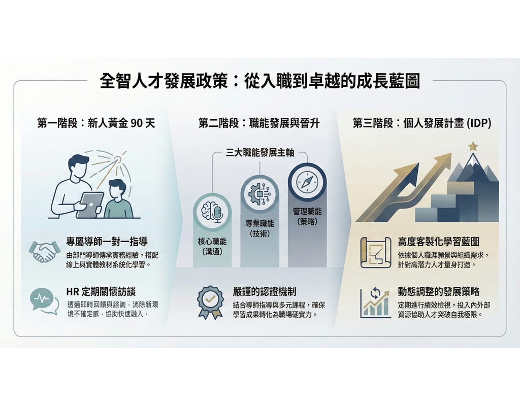 我們深信人才是企業前進的引擎,因此建置系統化的「職能發展地圖」,為您規劃清晰的晉升路徑。培訓體系涵蓋三大主軸:「核心職能」深化高效溝通與當責態度;「專業職能」依據職系提供六大核心工具與技術深造;「管理職能」則協助人才從基層帶領邁向策略規劃。結合導師的實戰指導、多元課程及嚴謹的認證機制,我們確保您的每一次學習都能轉化為職場上的硬實力,讓您的專業價值隨著職涯發展同步升級,在全智看見未來的無限可能。